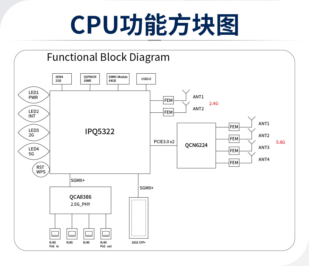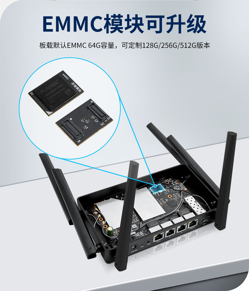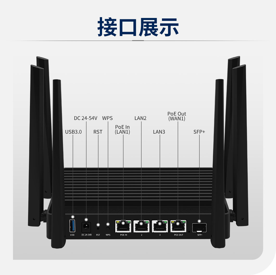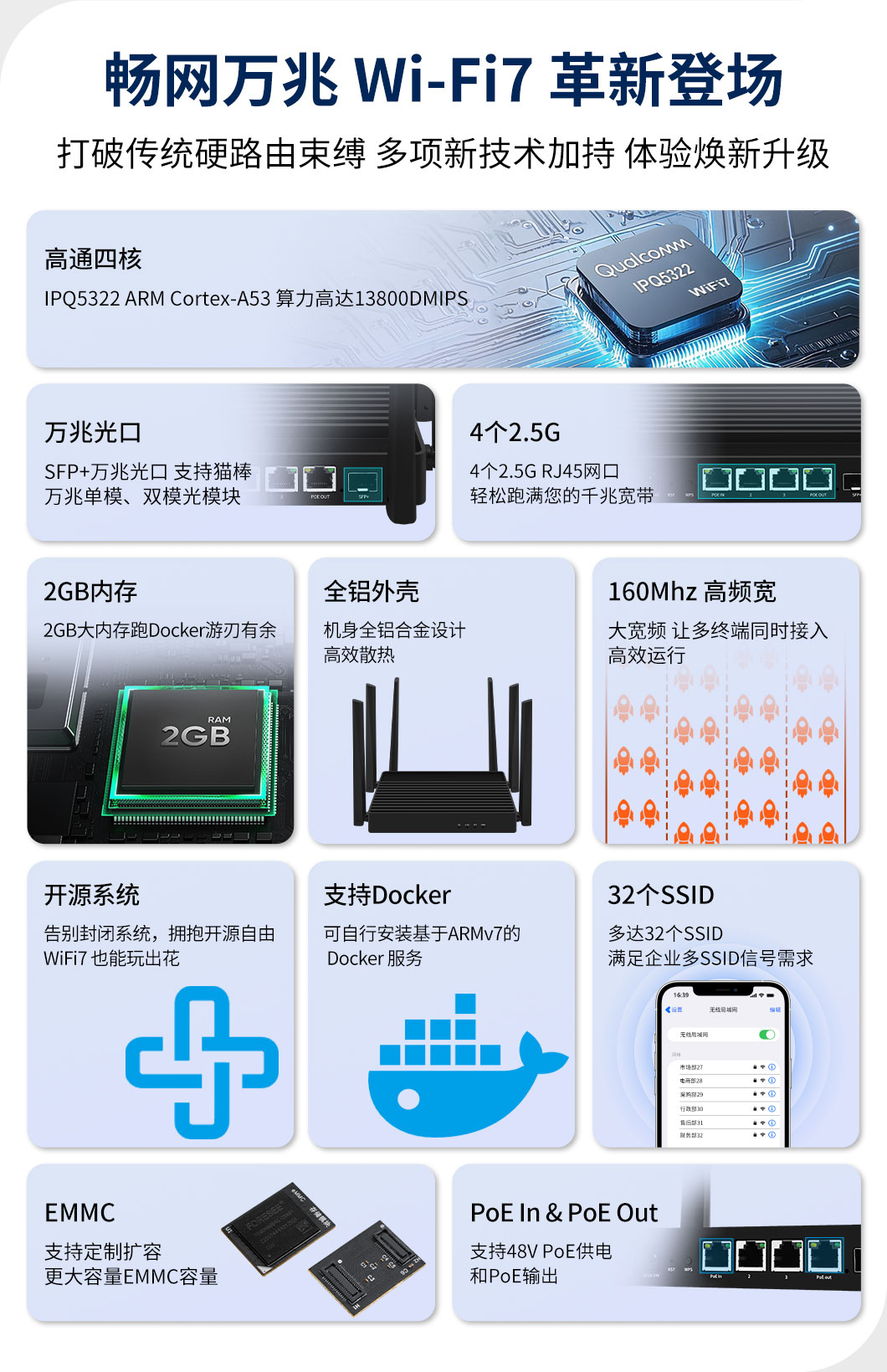 高通四核IPO5322 ARM Cortex-A53 | SFP+万兆光口 支持猫棒 | PoE In & PoE Out|4个2.5G RJ45网口 | 2GB内存 | 全铝合金机身 | 开源系统|支持Docker|